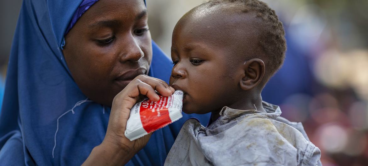© PAM/Arete/Siegfried ModolaUne mère déplacée nourrit son bébé avec une pâte à base d’arachide lors d’un exercice d’évaluation de la famine mené par le PAM au Nigeria.